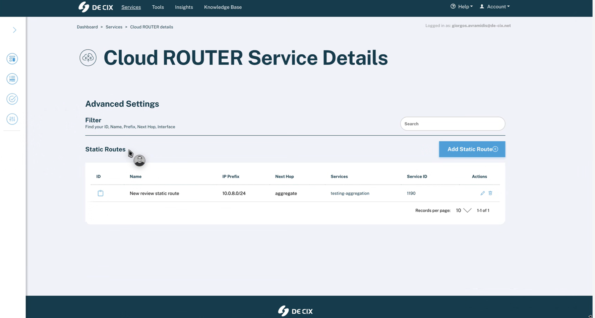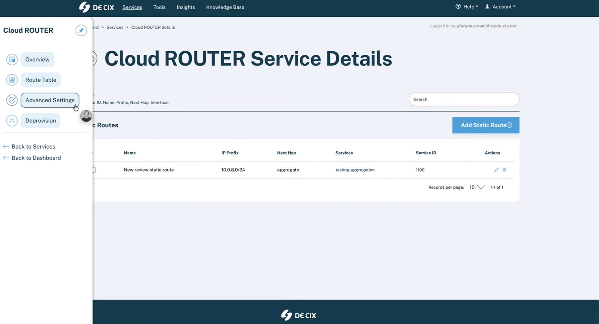 Static Routes and Route Aggregation extend the routing capabilities of the DE-CIX Cloud ROUTER by allowing customers to explicitly define routes and to summarize multiple prefixes into a single aggregate route. This helps to control route propagation, reduce routing table size, and address prefix limitations imposed by connected cloud service providers.