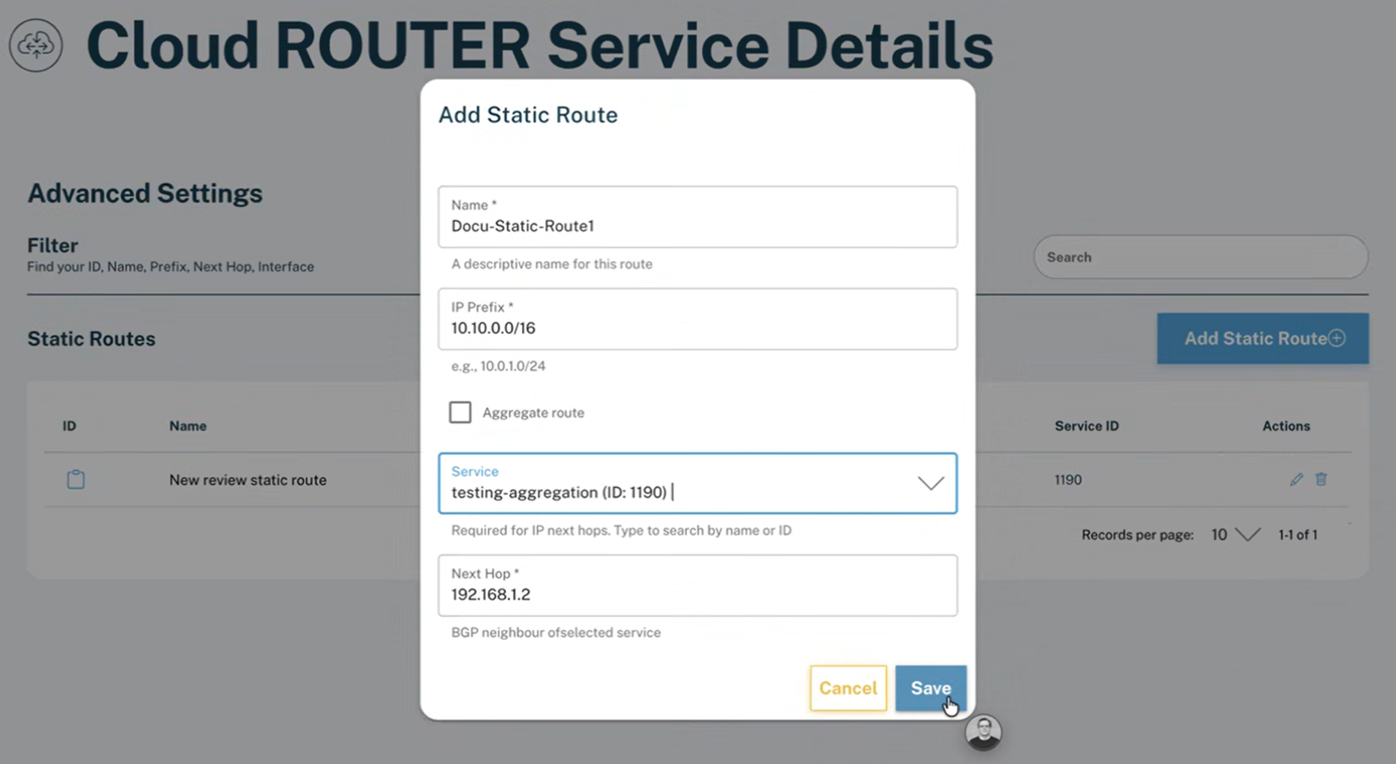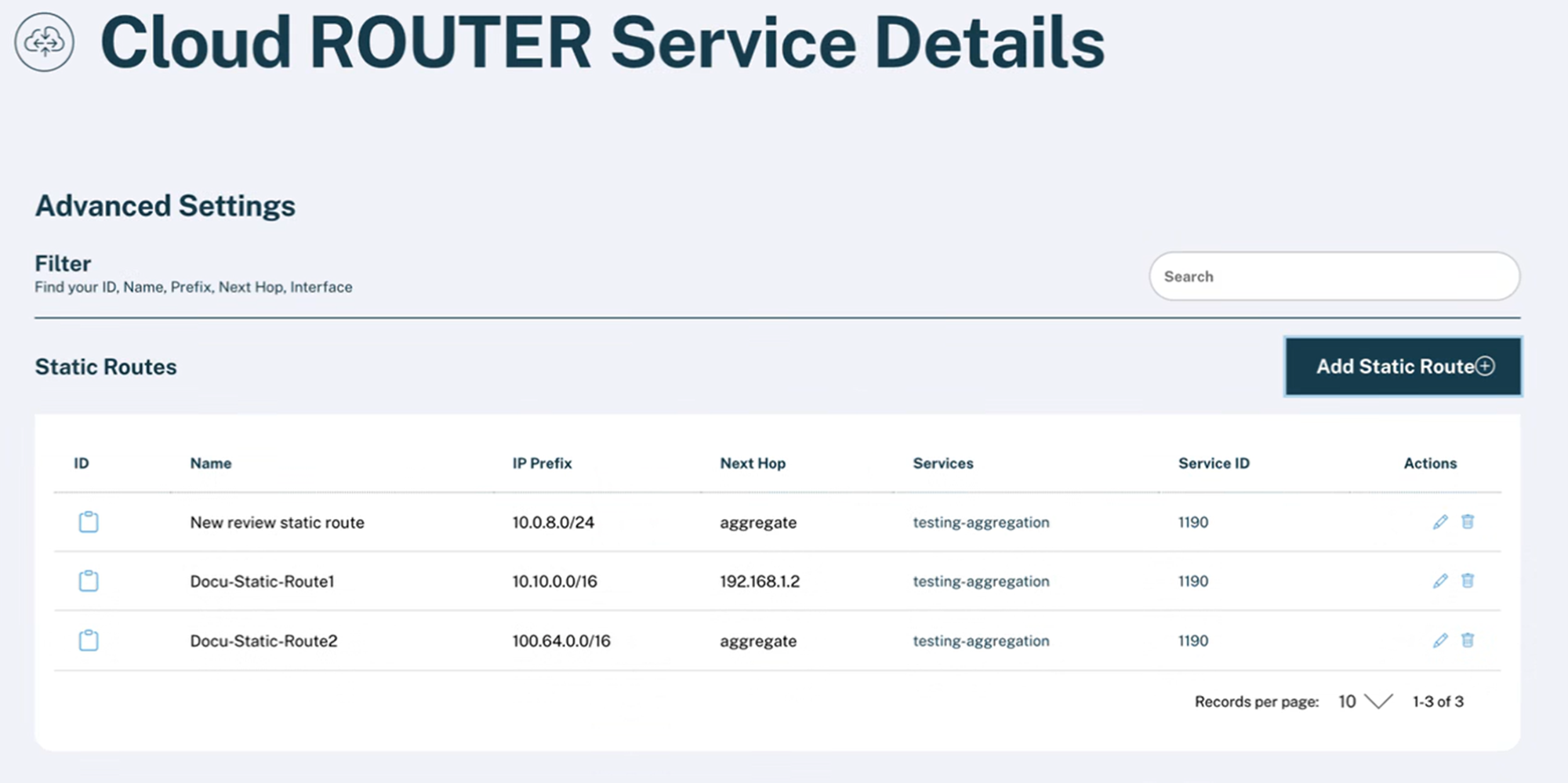 Static Routes and Route Aggregation can be configured via the Cloud ROUTER Portal and via the Cloud ROUTER API.